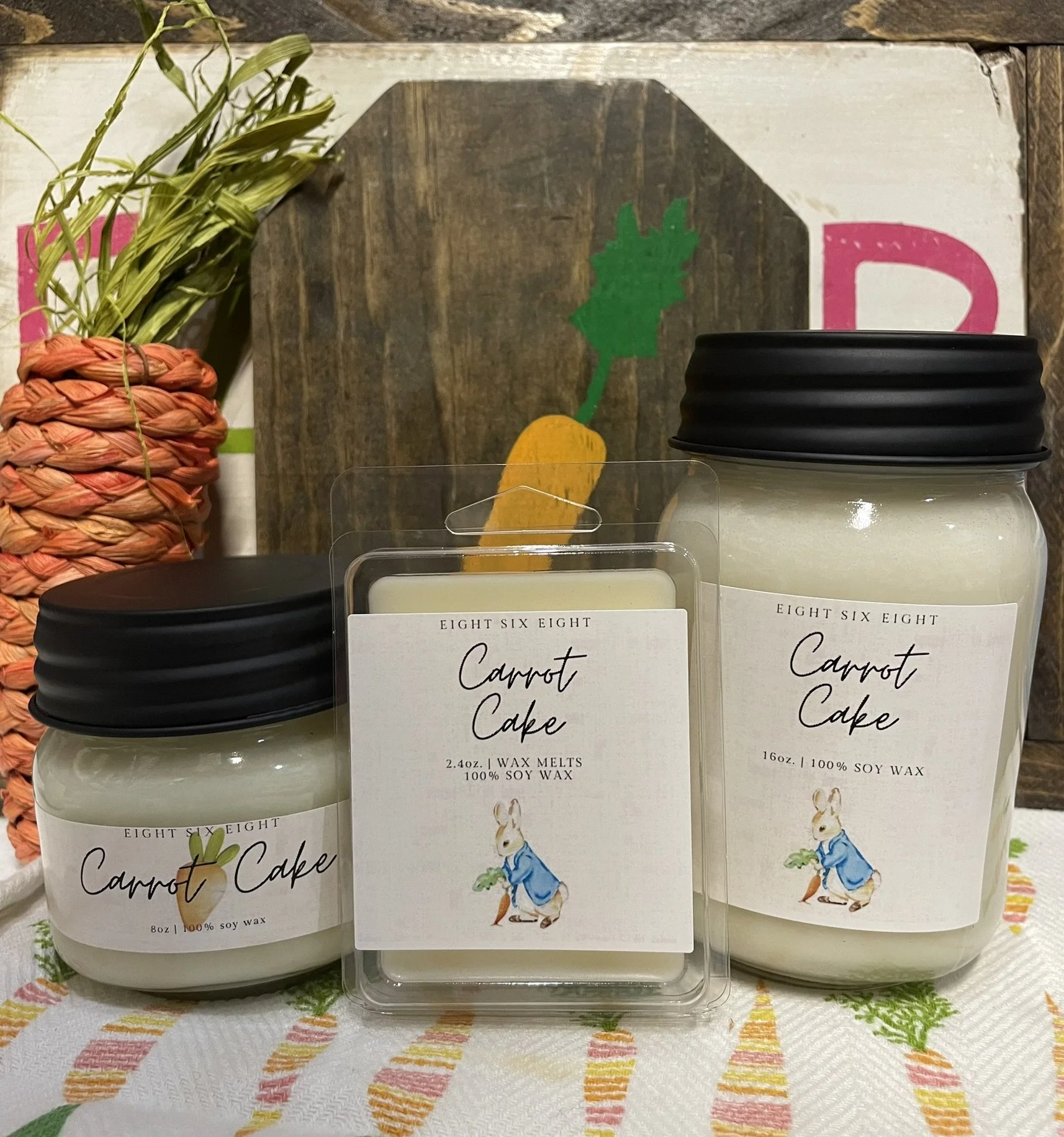 Shop › The Easter Collection Image 1 of 3 Image 2 of 3 Image 3 of 3 The Easter Collection from $5.00 Size: Select Size 8oz. Traditional Mason 16oz. Traditional Mason Wax Melt 17oz. Wood Wick 24oz. Woodwick Lacey Jar Scent: Select Scent Carrot Cake Add To Cart Added!